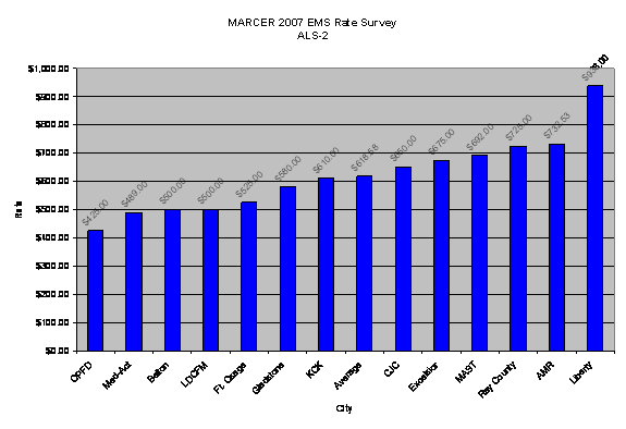 ALS-2 rates for the ambulance service providers surveyed ranged from $425 to $938.00 (see chart on page 5). The average is $618.58. LDCFM currently charges $500, which is 80.8% of the average. In 2006, LDCFM had 40 ALS-2 transports resulting in a charge of $20,000. In 2007, LDCFM had 50 ALS-2 transports resulting in a charge of $25,000. Raising the rate to the average would result in a $5,929 increase.
