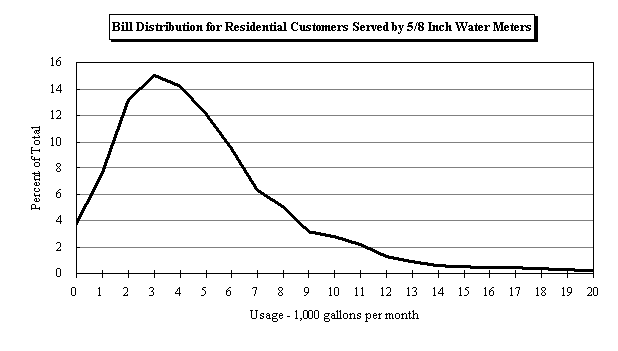 The graph below shows the water use distribution for residential customers. As you can see, the largest percentage of residential customers use between 3,000 and 4,000 gallons per month. The proposed 2009 water and sewer rates would increase the monthly bill by $1.31 and $1.56 respectively.