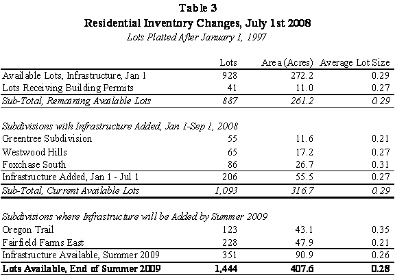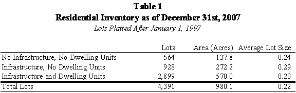 This memo provides an update to the available residential lot inventory conducted on December 31st, 2007. The following analysis includes new building permits through the first half of 2008 (January 1st-July 1st).