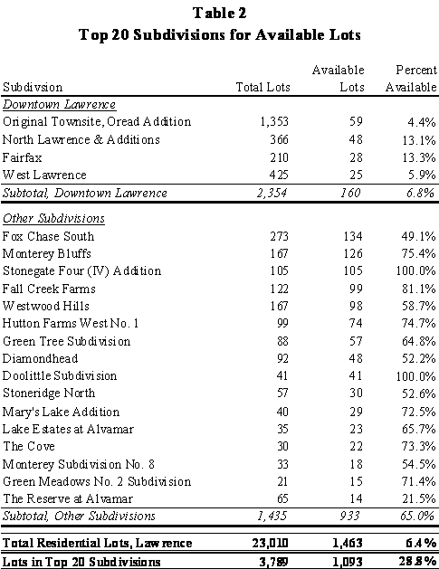 Including all single family lots regardless of when they were platted, in July 2008 there were 1,463 single family lots with infrastructure and available for development in Lawrence. Almost 1,100 of these available lots could be found in just 20 subdivisions. Four of these 20 subdivisions were in or near downtown and North Lawrence. However, in these four subdivisions near downtown, only about 160, or 7%, of all residential lots were available for development. The remaining 16 subdivisions accounted for 933 of the available lots. Many of these subdivisions were platted after 1997: