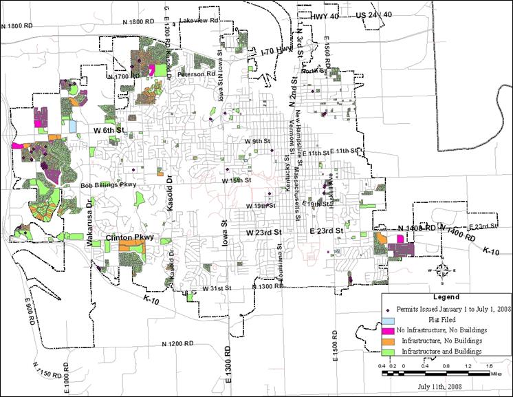 In January of this year, a survey was conducted that measured the number of residential lots platted since 1997 and their subsequent development. The survey found that, from 1997 to the end of 2007, almost 4,400 lots had been platted in Lawrence. Approximately 2,900 of those lots had been developed by the end of 2007. This equates to an average of 264 building permits per year over an 11 year period. By the beginning of 2008, about 1,500 of the platted lots remained for development, with 928 lots containing infrastructure and the remaining 564 lots platted, but containing no infrastructure. Map 1 provides an overview of where residential lots are located in the City, by readiness for development, as of the end of 2007: