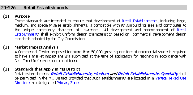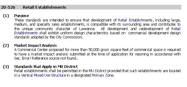 CRITERIA FOR REVIEW & DECISION-MAKING Section 20-1302(f) provides review and decision-making criteria on proposed text amendments. It states that review bodies shall consider at least the following factors: 1) Whether the proposed text amendment corrects an error or inconsistency in the Development Code or meets the challenge of a changing condition; and The proposed amendment corrects an error in the Development Code. The intent of the MU District was to permit a mix of uses (including retail uses) throughout each of the development zones in the district but to require that medium and specialty retail establishments only be permitted in the primary development zone given the scale and intensity of such uses and the intent of the primary development zone as being the zone permitting the most intense development. Section 20-525(4) of the existing language does not reflect this intent because this use standard discusses general retail sales, which are distinct from retail establishments. Such language in this use standard effectively prohibits all retail uses from other development zones since this section does not address retail establishments. Staff proposes deleting this section which then will allow general retail sales uses in any of the development zones in a MU District. Section 20-526(3) discusses retail establishments, therefore this is the most appropriate location in the Development Code for use standards regarding such establishments, however the language adopted is not precise enough because it does not specify which retail establishments may be permitted and where. The Development Code identifies three types of retail establishments; Large, Medium and Specialty. The use table does not permit large retail establishments but does permit medium and specialty. The intent of this use standard is to specify where these establishments may be permitted. During preparation of this amendment, staff discovered a word processing error in the formatting of the ordinance for the mixed use district that resulted in large retail establishments being shown as permitted in the MU District while not showing that medium retail establishments were permitted. Both the Planning Commission and City Commission approved the text amendment that permits medium retail establishments but prohibits large retail establishments. Staff recommends that the Planning Commission include with the subject text amendment an additional revision to the use table (excerpt shown below) to correct the error.