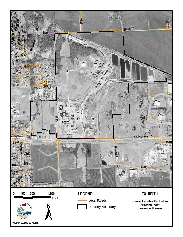 1. The Facility Property is located on the eastern edge of Lawrence on Kansas Highway 10 and the Facility Property is described by the approximate geographical area illustrated on the map attached hereto as Exhibit 1. The Facility Property includes approximately 467 acres of the former operating facility and 120 acres of contiguous parcels. For purposes of this CO, the Site (“Site”) includes the above described Facility Property as well as all areas, and media, where contamination from the Facility may have emanated or migrated.