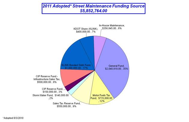 2011 Street Maintenance Program & Funding . In August 2010, the City commission approved approximately $5.85 million to be utilized for the 2011 Street Maintenance Program. The pie chart below gives a breakdown of the various funding sources. The “Proposed 2011 Comprehensive Street Maintenance Program” map is attached to this document. The map includes streets identified for crack sealing, microsurfacing, mill and overlay/curb and gutter, internal street maintenance project areas that include concrete rehabilitation work, and other project locations such as the KLINK and CIP/Sales Tax projects.
