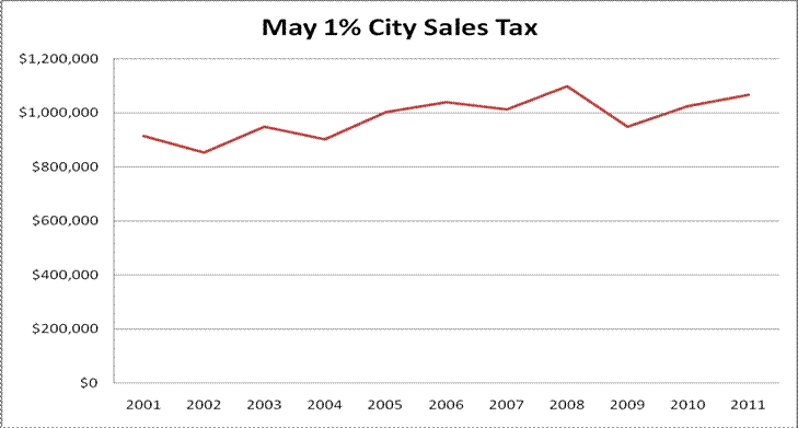 A spreadsheet showing total monthly sales tax distributions since 2001 is attached. Additional sales tax information is provided in the tables and graphs below.