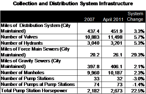 Generally reduced water production on an average day basis does not significantly reduce workload. The number of facilities, their size, and peak capacities are more of a driver of staffing needs and workload. Overall, the infrastructure the department is responsible for has, and continues, to increase (see table) and therefore the workload and resource needs have also increased, even though average day water production is lower. When efficiencies have reduced workload, much of that has been redirected to respond to these increased needs.