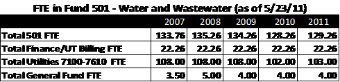 Since 2007, the number of full-time employees (FTE) funded by the water and wastewater rates has decreased by 5 in Utilities and increased by 0.5 in the General Fund for a net decrease of 4.5. See table below.