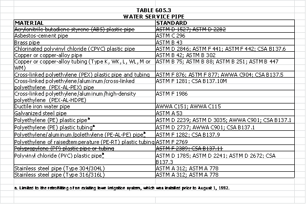 5-506 Table 605.3, "WATER SERVICE PIPE," of the 2012 International Plumbing Code is hereby amended to read as follows: