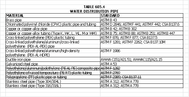 5-507 Table 605.4, "WATER DISTRIBUTION PIPE," of the 2012 International Plumbing Code is hereby amended to read as follows: