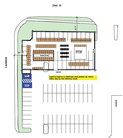 ADA accessible parking is available to the Checkers patrons, but these parking spaces are not near the special event area. Two ADA parking spaces, with one being van accessible will be provided next to the Special Event Area along the Louisiana Street frontage. The parking spaces will need to be signed with appropriate ADA signage and the van accessible space in between will need to be striped.