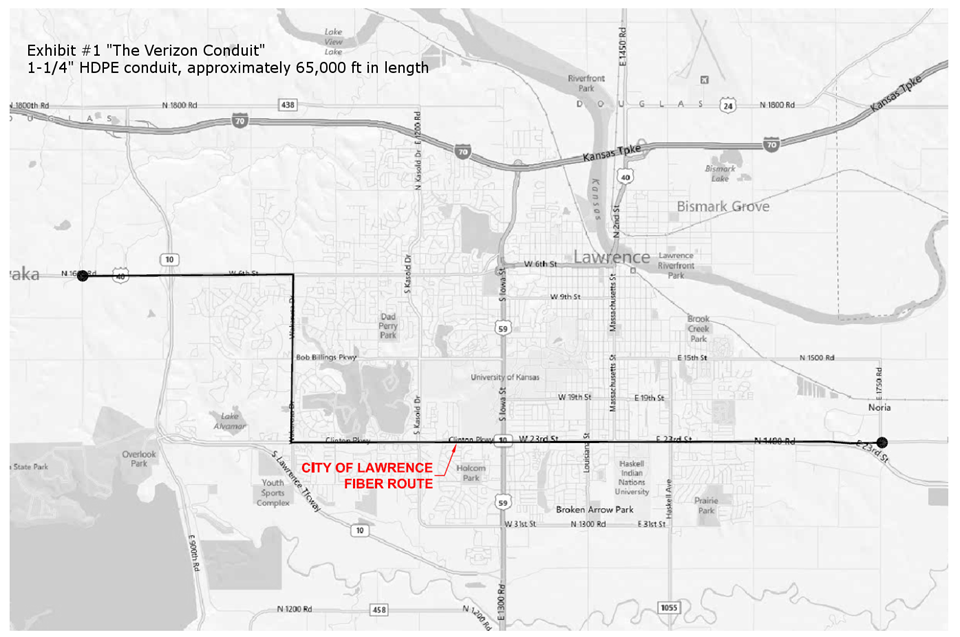 This is an existing fiber filled conduit owned by the City of Lawrence. The City owns 144 Strands of fiber beginning at a telecom cabinet near Teepee Junction (Intersection of 59 Highway and 20/40 Highway) and continuing to a handhole pullbox at Sixth Street and Massachusetts Street The City hereby grants to KU an irrevocable right to use 12 fiber strands (in a common fiber “buffer tube”) in exchange for KU’s investment in the Verizon Conduit Fiber project.