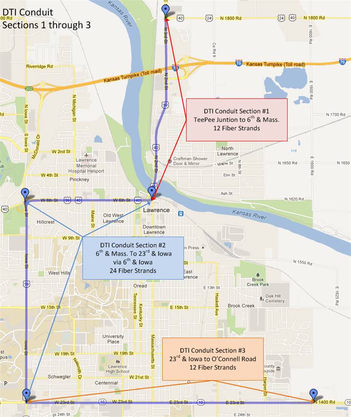 · From Sixth and Massachusetts Street (the end of DTI Conduit Section #1), continuing west along Sixth Street to the intersection of Sixth Street and Iowa Street.