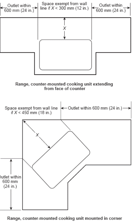 (1)        Any space 600 mm (2 ft) or more in width (including space measured around corners) and unbroken along the floor line by doorways and similar openings, fireplaces, and fixed cabinets doorways, fireplaces, and similar openings.