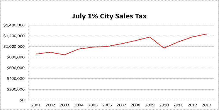 The 2013 budget for the total sales and use tax distribution is $32,737,625.  A summary of the latest city sales/use tax distribution is shown in the table below.  The first half 2013 sales tax distribution was up 1.5% compared to the first half of 2012.