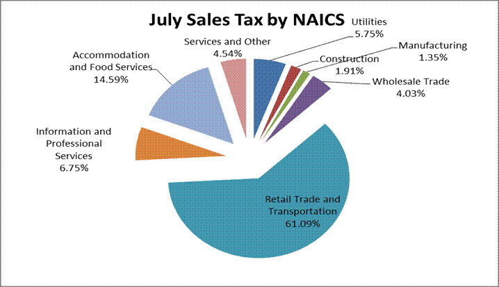 A spreadsheet showing total monthly sales tax distributions since 2001 is attached. Additional sales tax information is provided in the tables and graphs below.