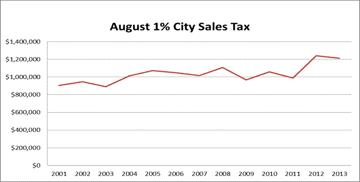 The 2013 budget for the total sales and use tax distribution is $32,737,625. A summary of the latest city sales/use tax distribution is shown in the table below. The first half 2013 sales tax distribution was up 1.5% compared to the first half of 2012.