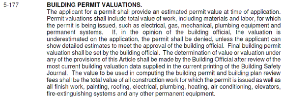 Building permit fees are determined based on the estimated permit value at the time of application in accordance with Section 5-177 of the City of Lawrence Code: