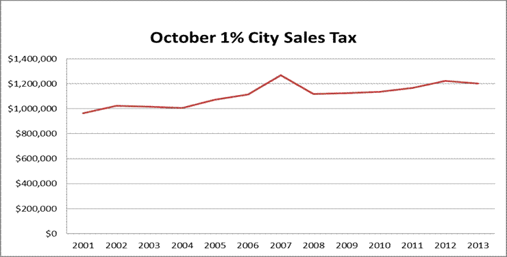 The 2013 budget for the total sales and use tax distribution is $32,737,625. A summary of the latest city sales/use tax distribution is shown in the table below. The first nine months of 2013 sales tax distribution was up 2.7% compared to the first nine months of 2012. A total of $520,145 has been paid to the Oread TIF district in 2013.