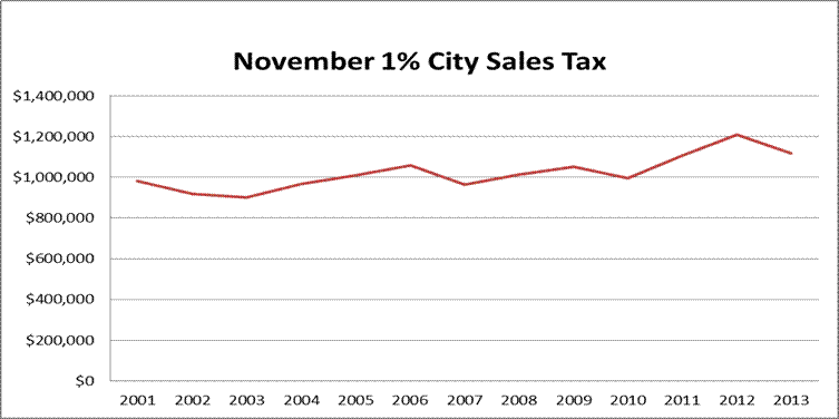 A spreadsheet showing total monthly sales tax distributions since 2001 is attached. Additional sales tax information is provided in the tables and graphs below.