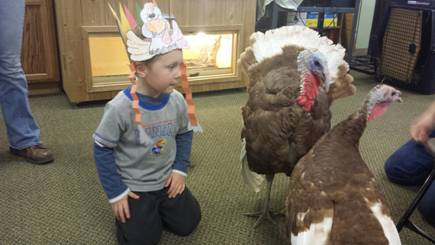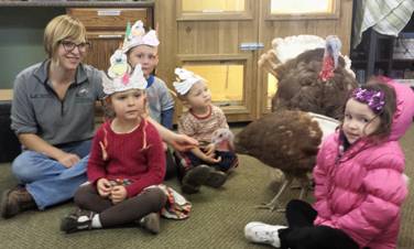 Dara Wilson, a naturalist at Prairie Park, brought in the turkeys to show children for a seasonal program of the weekly Wild Adventures for Preschoolers and Parents class at the Prairie Park Nature Center. Wilson hand-raised the male and female turkeys. Note: The turkeys were safe and didn’t make their way to a table on Thanksgiving.