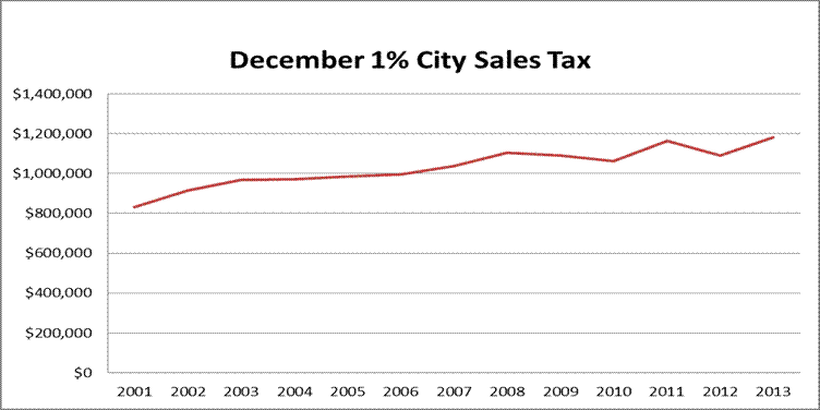 The City of Lawrence has recently received its December sales tax distribution. The distribution is the result of retail sales from mid-October to mid-November. The distribution of $2,831,942.19 is about $230,000 more than the prior year distribution for the same month. It includes $22,899.92 from the Oread and Free State TDD’s. The distribution also includes other amounts that will be paid to the Oread Tax Increment Financing District.