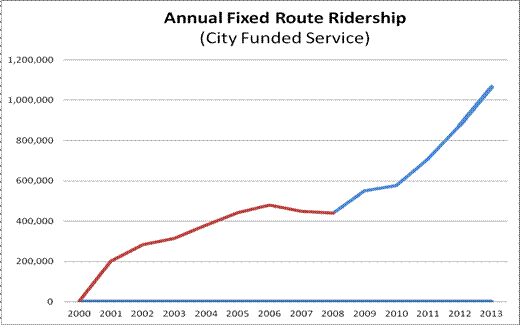 Ridership on fixed route service has increased every year since the passage of the Transit Tax Referendum in 2008. Beginning in 2009 staff began restructuring routes in order to take advantage of coordination and to correct issues with service. Service changes have taken place every subsequent year and have resulted in ridership increases that, for the first time, eclipsed one million passengers in 2013. As can be seen in the following graph total annual fixed route ridership has grown from 437,671 in 2008 to 1,063,128 in 2013 which amounts to 142% increase.