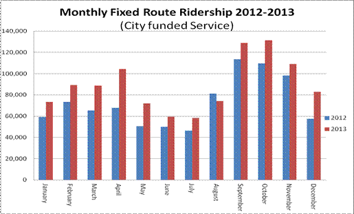 Over the last year (2012-2013) ridership on fixed route service has increased 22%. During that time there was only one month (August) that ridership did not increase over 2012. This was primarily due to the later start date for classes at the University of Kansas. The following graph also highlights monthly fixed route ridership in excess of 100,000 passengers for the first time in our history.