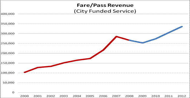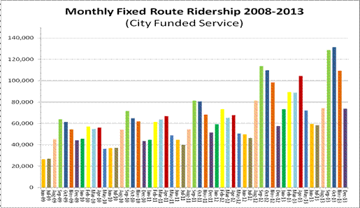 Historically, monthly fixed route ridership has increased steadily since 2008. As can be seen in the following graph, when comparing like months (ex. September 2009 to 2010) ridership has increased for each succeeding year since 2008.
