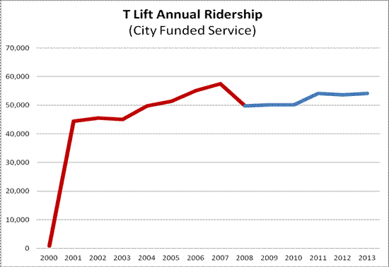 Ridership on T Lift has been fairly consistent since 2008. From 2001 to 2007 ridership grew at a steady pace. Due to the high operating cost of T Lift efforts were made to change the certification process which resulted in a decline in ridership. From 2008 until 2013 ridership has been fairly consistent.