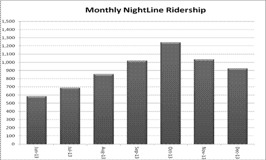 In June 2013 Lawrence Transit began operating a service known as NightLine. This service was planned to operate for one year as a pilot service. As can be seen from the following graph, the ridership grew steadily from June through October. Ridership since October has fallen but is typical of lower ridership on all service during both November and December.