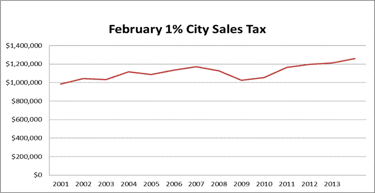 spreadsheet showing total monthly sales tax distributions since 2001 is attached.