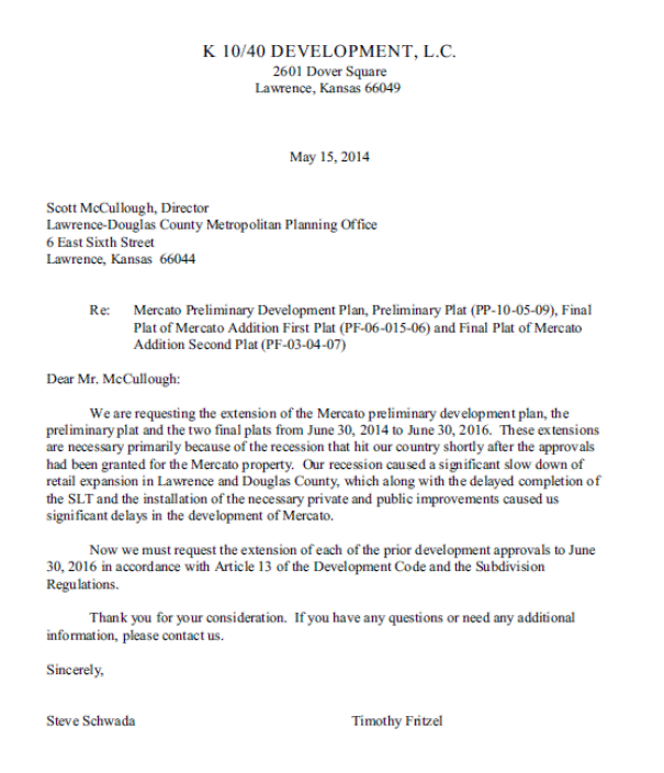 A written request for an extension of the approval for the Preliminary Development Plan was submitted prior to the expiration date, June 30, 2014. (Attachment A) The applicant indicated that development of this area has been slower than anticipated due in part to the slow economy and the delayed construction of the South Lawrence Trafficway.