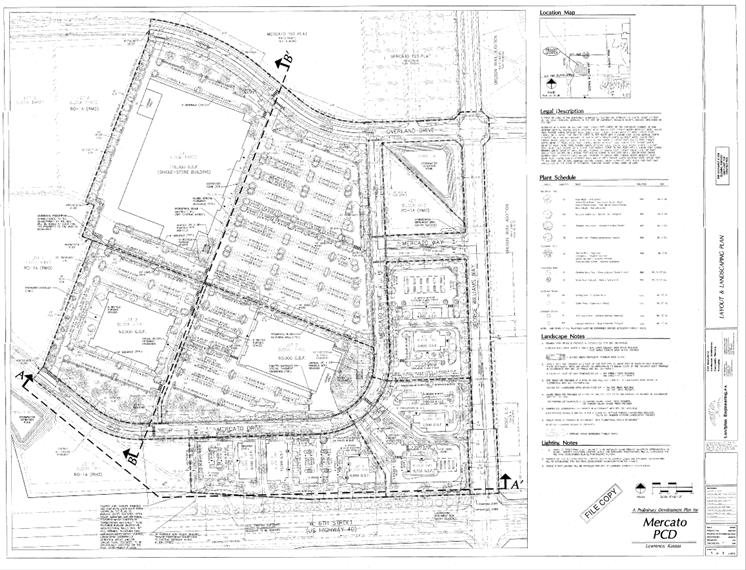 Following the approval of the Preliminary Development Plan in 2007, final plats were submitted and approved for the Mercato property. A rezoning in 2009 increased the commercial area in the development and a revised preliminary plat reconfigured the interior street layout, created additional right-of-way for a right-in/right-out on W 6th Street/Hwy 40, and provided for the construction of Renaissance Drive to the west of the subject property. The Planning Commission’s approval of the preliminary plat in 2009 was conditioned on the revision of the final plats.