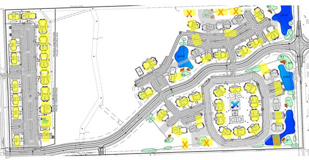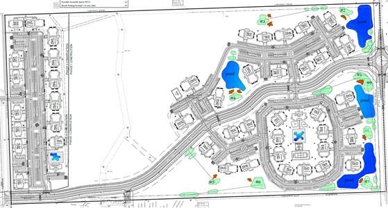 Figure 3. PC approved layout overlaid on revised plan for comparison. Apartment buildings along the north and south perimeter of the east side, Phase 1, that were removed with this revision are crossed out. |
