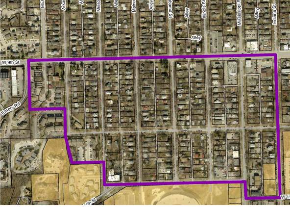 The survey area consists of approximately 12 blocks bounded by Indiana Street on the east, Emery Road on the west, 9th Street on the north, and 11th Street on the south. A total of 223 historic resources survey forms were entered into the interactive online database maintained by the Kansas State Historic Preservation Office. Some properties with similar multiple buildings on a single lot were entered on one survey form and some properties with dissimilar multiple buildings on a single lot were entered on separate forms.