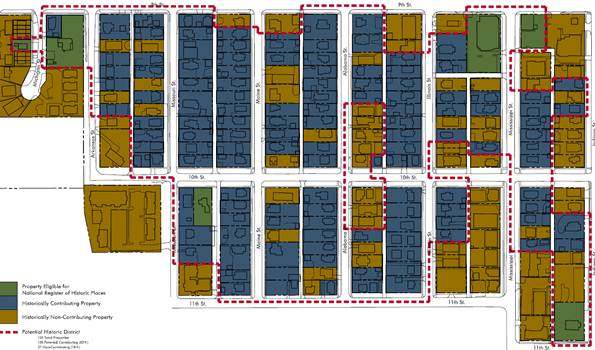 The boundaries proposed by Stan Hernly, who completed the survey, were too gerrymandered to be a proper historic district. There were concentrated blocks that would make historic districts. The 900 block of Missouri was identified as one of those areas. The survey document was completed in September 2010.