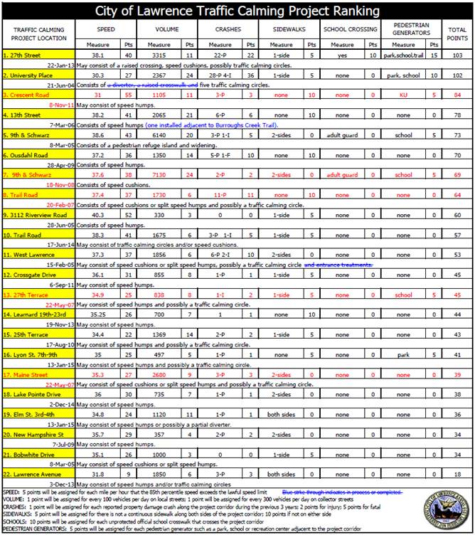 Community expectations are high. The budget only includes $70,000. An intersection such as 6th & Wakarusa will cost $25,000; crosswalks at a 4-way intersection will cost $10,000. Lane lines must also be maintained on all roads. We can paint when temperatures and moisture are favorable. Painting will last approximately 6 months. The City maintains 520 crosswalks including 60 school crosswalks. |
