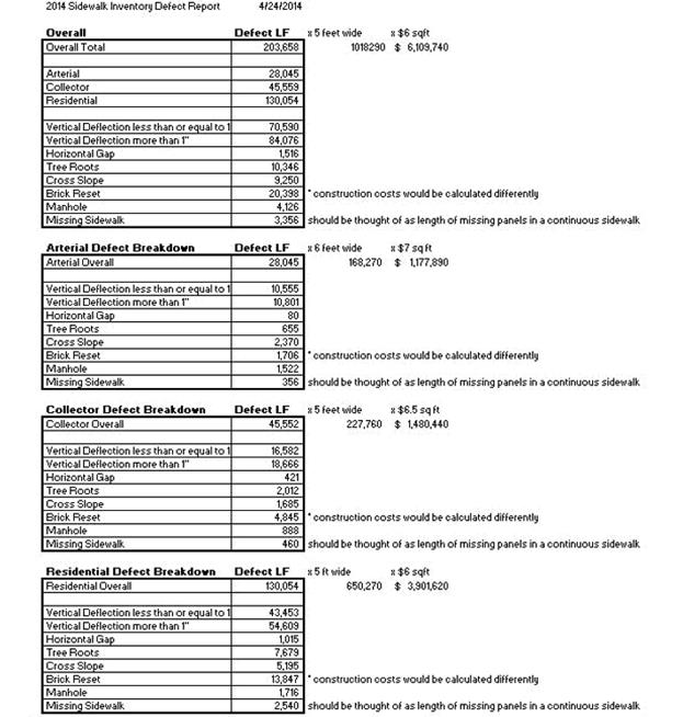 Total summary of defects and breakdown of quantities were categorized by arterial, collector and residential. (See attached report). In total 203,658 linear feet of defects were identified. While sidewalks vary in width depending on their location we assumed an average of 5’ width to calculate quantities and cost. Total quantities of repairs equal 1,018,290 SF with a total repair cost of $6,109,740. This number is based on an average of $6.00 / SF. We know that some areas will cost more to repair due to issues currently not identified, such as, property acquisition, slope and cross slope, retaining walls, tree removal, storm sewer, utility relocation, and sprinklers for example. It also does not address ADA ramp issues or missing / GAP sidewalks.
