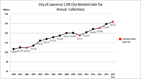 The following graph depicts the collection trend in the City’s 1.0% city retailers’ sales tax since 2000.