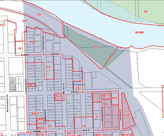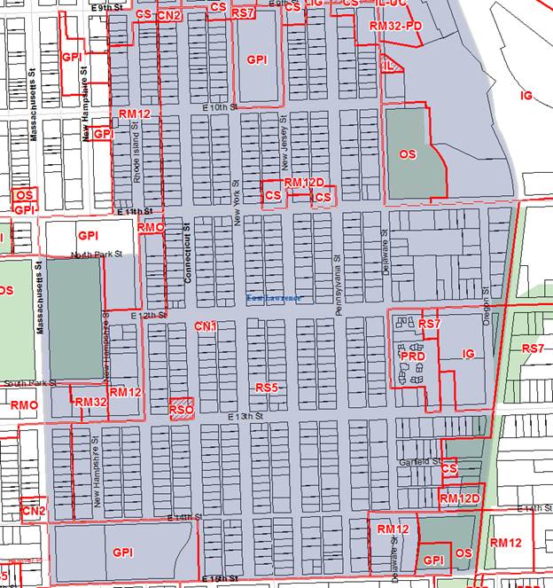 As shown in Figure 2b below, the area south of E 9th Street in the East Lawrence Neighborhood is primarily zoned RS5 District; however, this area consists of a variety of other zoning districts. The west boundary of the area contains RM12 and RM32 Districts. The east boundary contains IG (General Industrial), OS (Open Space), PRD (Planned Residential), GPI (General Public and Institutional Use), and small pockets of Multi-Dwelling Residential. The uses of the area south of 9th Street generally conform to their current zoning and this area has not been identified by the neighborhood as an area in need of rezoning.