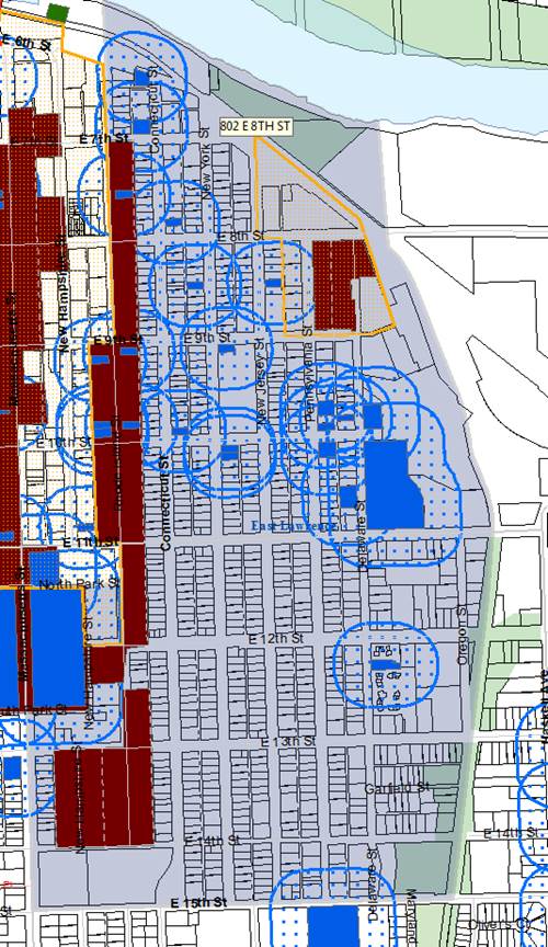 Section 20-301 of the Development Code defines an overlay district as a “tool for dealing with special situations or accomplishing special zoning goals.” Overlay Districts are placed on the base district classifications to alter the regulations of the base district. As a tool for the area north of E 9th Street in the East Lawrence Neighborhood, an Urban Conservation Overland District (UCO) could be considered. This zoning tool may address the concerns of the landowners by encouraging development that conforms to the size, orientation and setting of existing buildings in the neighborhood. It can also foster development that is compatible with the scale and physical character of the original buildings in the neighborhood through the use of Development/Design Standards and guidelines. At this time, the city has two UCO districts (Downtown and 8Th & Pennsylvania Street) and is processing one for the Oread Neighborhood.