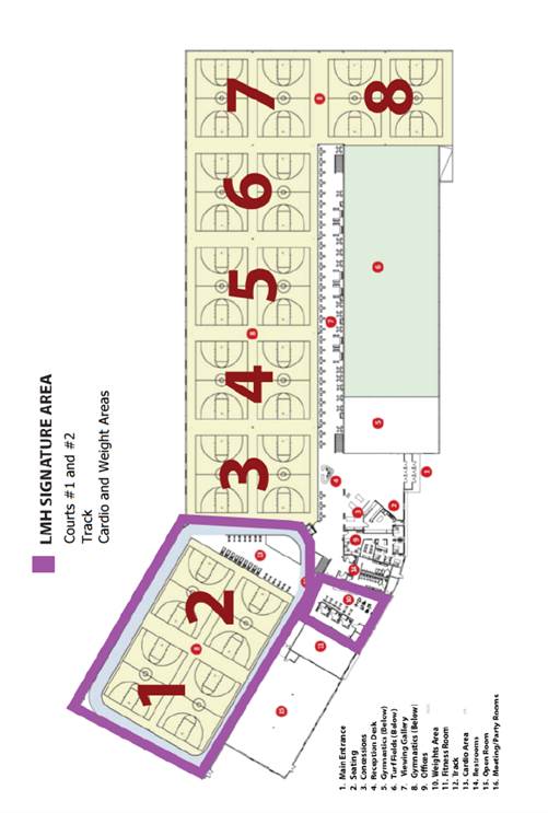 WHEREAS, the SPL is an approximately 181,000 square foot recreation center consisting of eight (8) full-sized basketball courts or 16 full-sized volleyball courts, an indoor soccer / sports arena, 1/8-mile indoor walking / jogging track, a cardio / weight area, meeting rooms, concession and lounge areas, scoreboards, signage, and other amenities (“the Recreation Center”);