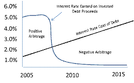 Arbitrage is a normal occurrence but having an arbitrage liability due to the IRS has typically not been a concern for any debt issued after 2008. This is because interest rates on debt proceeds dropped dramatically after that time. However, debt issued prior to 2008 and still held by the City could have had an arbitrage liability for the first several years after the bonds were issued as shown on the following chart.