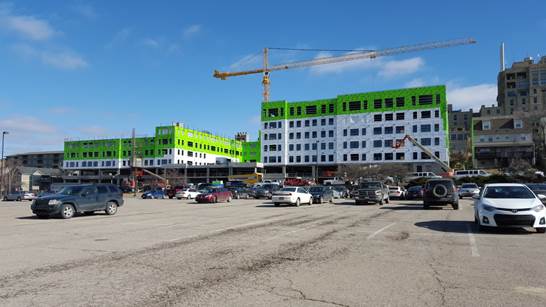 The photo below, taken today, reflects that the south portion (right side on photo) is complete in terms of the number of floors approved with the original plan. The north side (left side of photo) reflects work on the 6th floor.