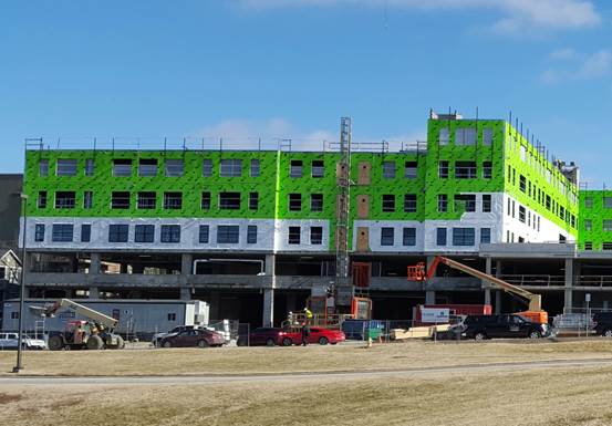 Roofing and framing for the south portion of the building is nearing completion. Five of eight floors, including the parking levels, are framed on the north portion. Framing on the 6th floor has begun and is expected to be completed by the end of next week. Floors 7 and 8 are scheduled to be completed by the end of February. At that time, the building’s shell will be completed and work on the interior will begin. Mechanical, electric, and mechanical systems are being roughed-in as floors are completed.