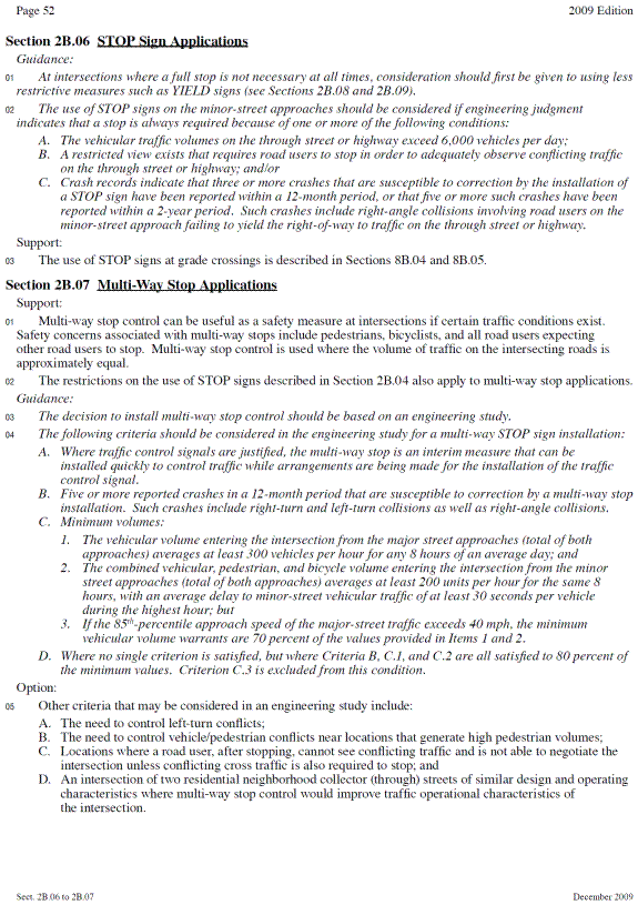 The use and application of STOP signs are prescribed by the Manual on Uniform Traffic Control Devices (MUTCD) (see attachment), published by the Federal Highway Administration and adopted by Kansas State Law and City Ordinance. Traffic counts were obtained at 27th Street & Louisiana Street and at 27th Street & Ridge Court during late September and early October, and neither of the locations met the minimum criteria for consideration of an ALL-WAY STOP as prescribed by the MUTCD. 27th Street has only fifty four percent (54%) of the required traffic at Louisiana and Ridge Court has only fifty seven percent (57%) of the required traffic.