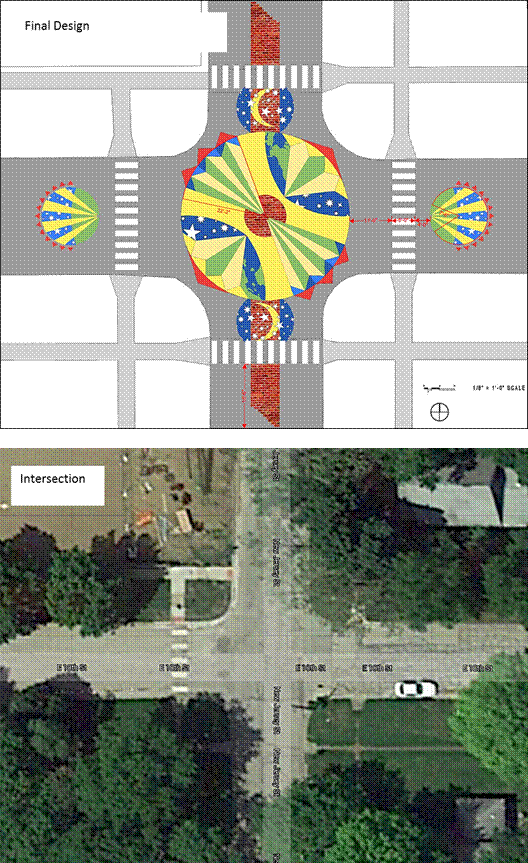Alicia Kelly, Katy Clagett and Jacob Brewer have designed and stewarded this community-engaging project and have worked closely with Public Works to assure all of the proper approvals and permissions have been obtained to implement the application of the painted mural on the intersection on Saturday, April 23, 2016 (rain date is April 30). – See the final mural design, page 3