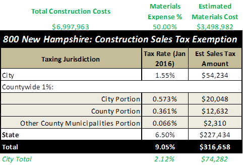 The costs of incentives are restricted to a sales tax exemption on construction materials for the project. Staff recently updated the projections for sales tax savings on the construction materials based upon January 2016 Kansas State sales tax rates. Below is a chart showing the savings broken out by jurisdiction. The State of Kansas by far is the largest factor in the overall sales tax savings because it has the highest sales tax rate.