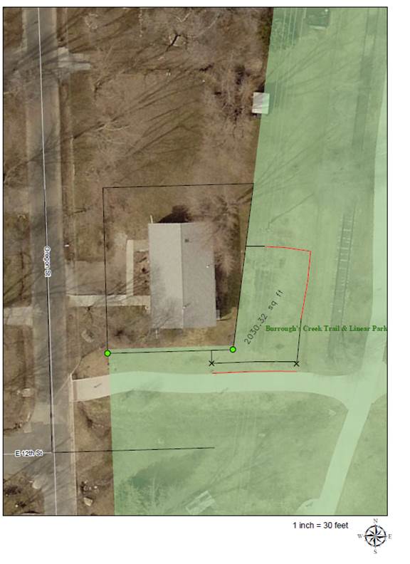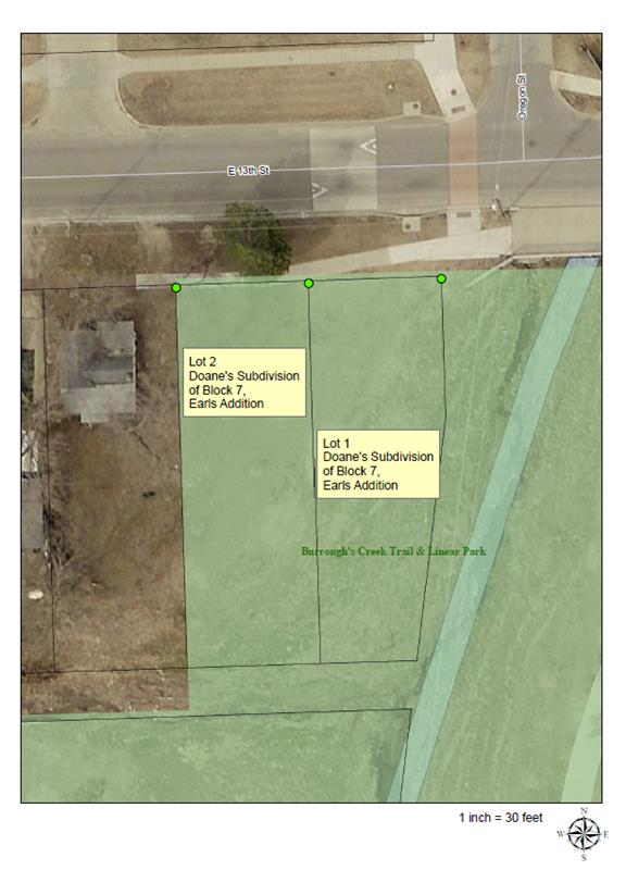 Lawrence Community Orchard: The City also received a request from the Lawrence Community Orchard, a current Common Ground participant at 830 Garfield St., to expand their orchard north to two city-owned parcels adjacent to 13th street. The Lawrence Community Orchard maintains a diverse orchard for free picking by all residents. By expanding their property north to 13th street, they hope to be more accessible and visible to the community, and provide a point-of-interest along the Burroughs Creek Trail.