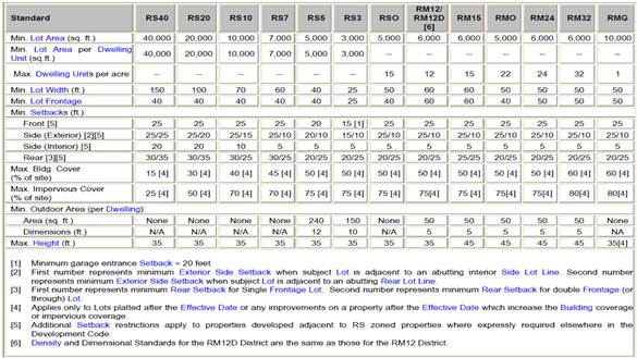 Section 20-601(a) in the Development Code provides the density and dimensional standards for all residential zoning districts in the following table: